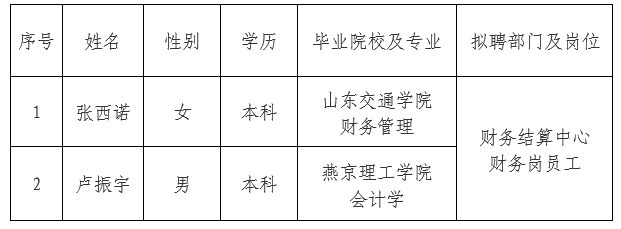 依据出资人代表机构审批意见,欧冠联赛平台委托第三方机构面向社会公开招聘财务岗员工2人。现对拟录用人员信息进行公示,公示期间如有异议,可通过电话、信函等方式反映,反映意见请署真实姓名。