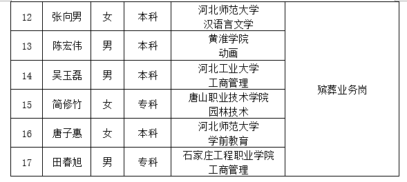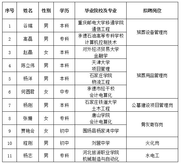 因公司发展需要,承德市国瑞置业有限公司委托第三方机构面向社会公开招聘殡仪馆运营各岗位人员17名。现对拟录用人员信息进行公示,公示期间如有异议,可通过电话、信函等方式反映,反映意见请署真实姓名。