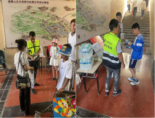 近日,受暖性高压脊影响,我市迎来持续数天的高温天气,相关部门相继发布了高温橙色、红色预警。市国动办、市欧冠联赛平台在避暑山庄门前地下人防停车场设置了“高温天气便民服务点”,为外地游客和本市市民免费发放矿泉水和藿香正气水,为出游的游客和市民提供饮水和预防中暑药物,受到了广大群众的一致好评。